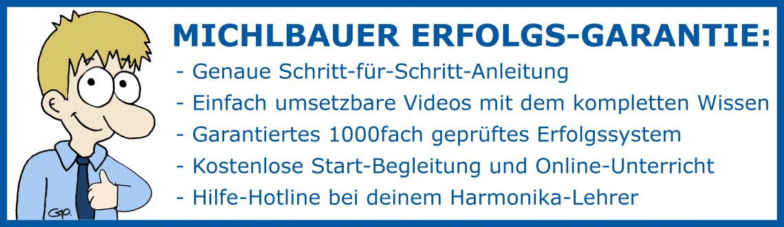 Michlbauer Kunden können sich auf die jahrzehnte Erfahrung im Harmonikaunterricht verlassen. Als weltweit größte Ausbildungsstätte für Steirische Harmonika ist die Michlbauer Harmonikaschule mit den Sorgen der Harmonikaspieler bestens vertraut. Die 100% Zufriedenheits-Garantie steht für kompetente und persönliche Beratung, sowie für Produkte in erstklassiger Qualität und das zu einem wirklich fairen Preis. Für dich bedeutet das, dass du dein Geld wenn du nicht zufrieden bist, zurück bekommst, ohne Wenn und Aber! |