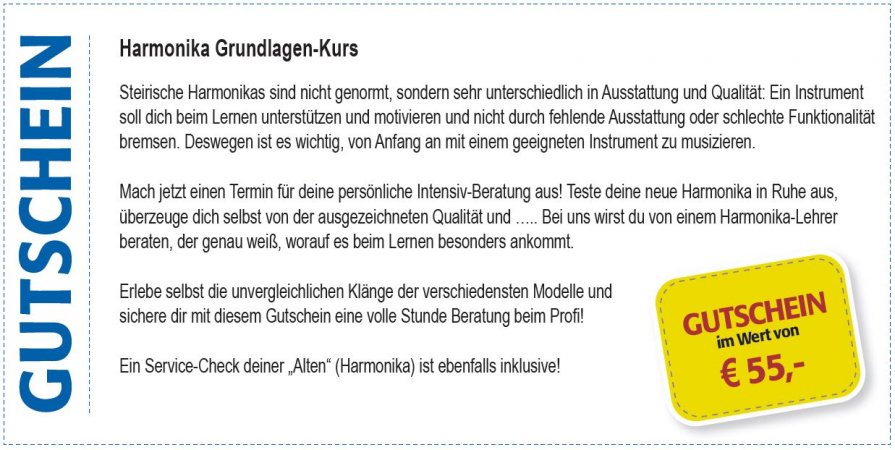 Gerne bin ich dir bei der Auswahl deiner neuen Harmonika behilflich und werde mich dazu mit ein paar Fragen direkt mit dir in Verbindung setzen, damit du die richtige Entscheidung treffen kannst.